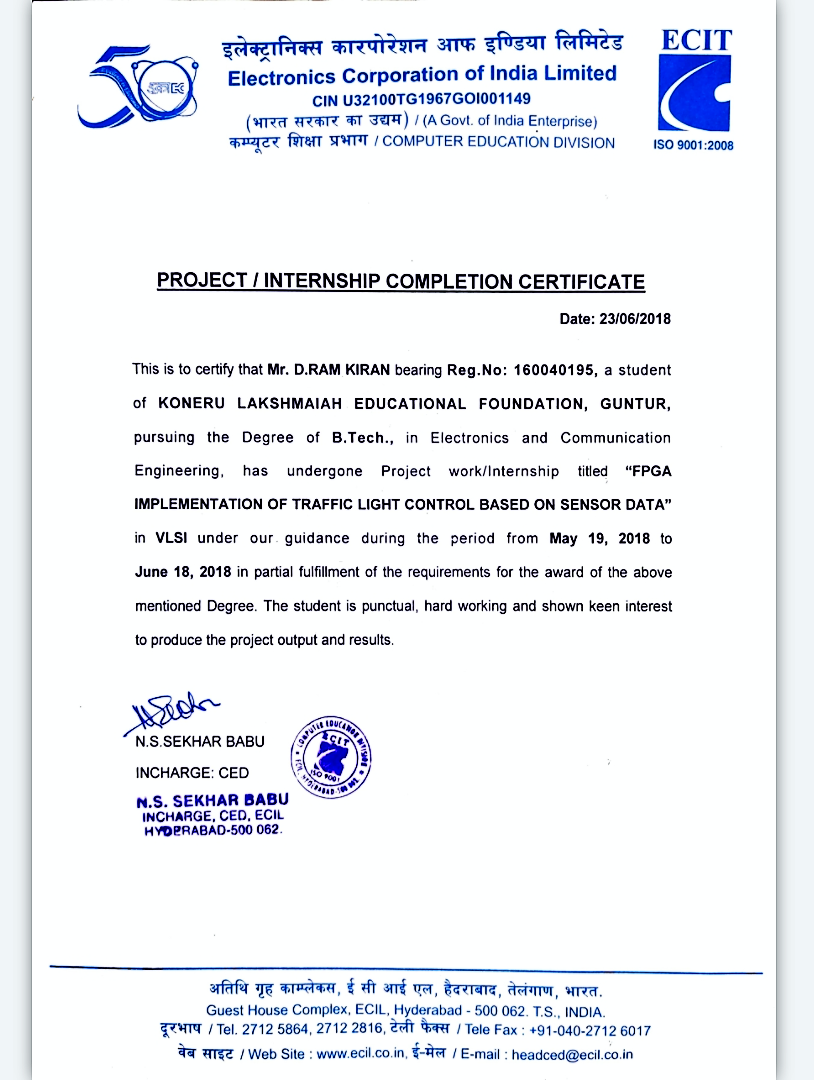 - Undergone a project based internship on "FPGA IMPLEMENTATION OF TRAFFIC LIGHT CONTROL BASED ON SENSOR DATA" in VLSI.