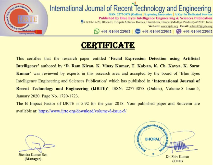 - Participated in many research activities, including with a publication on various methodologies of Facial Expression detection on IJRTE, Volume-8 Issue-5, January 2020