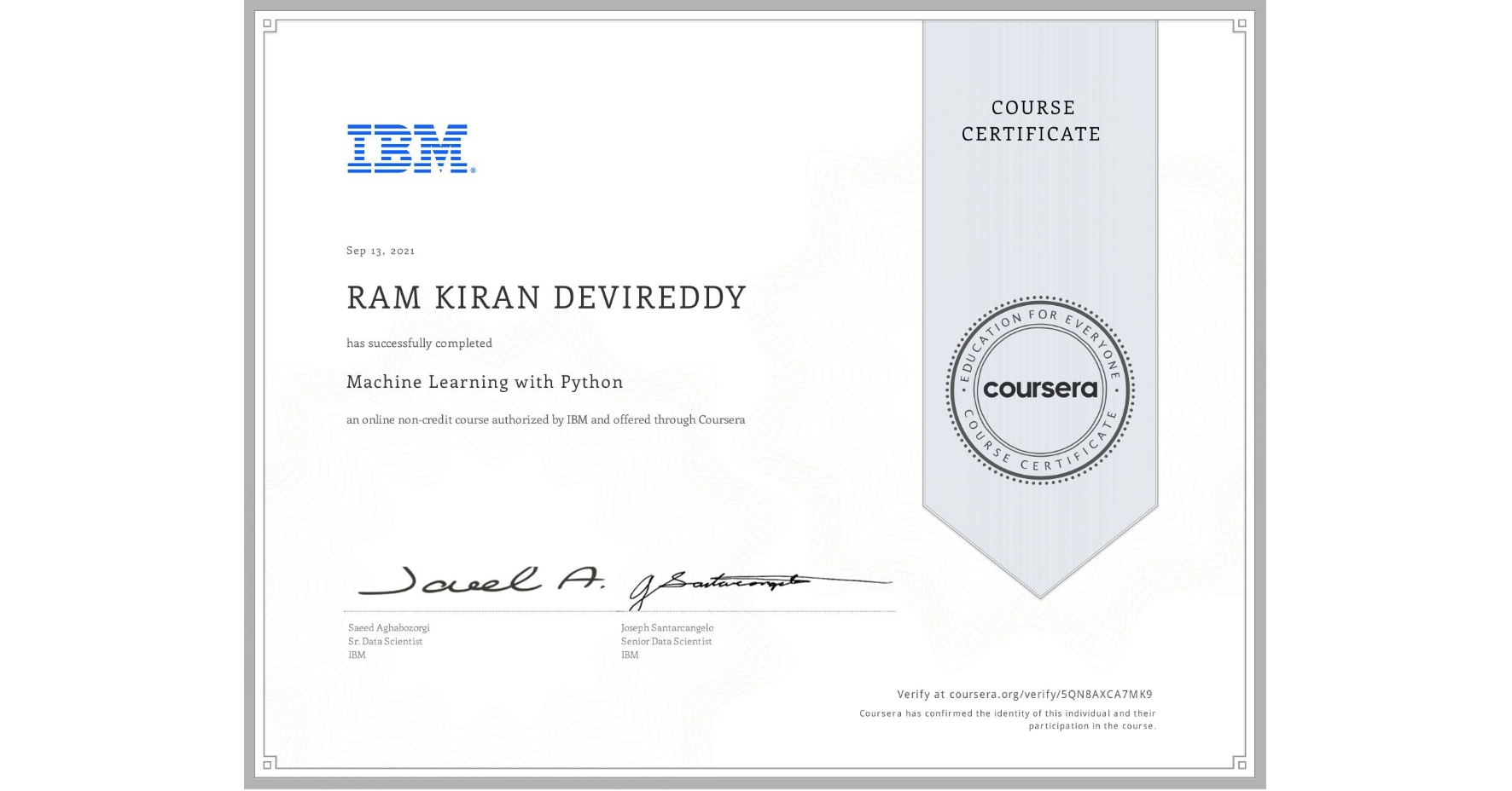 - Certificates Completed Tools for Data Science, Data Visualization with Python, Applied Data Science Capstone, Databases and SQL for Data Science with Python with Honors, Data Science Methodology, Python Project for Data Science, What is Data Science?, Python for Data Science, AI & Development, Machine Learning with Python, Data Analysis with Python