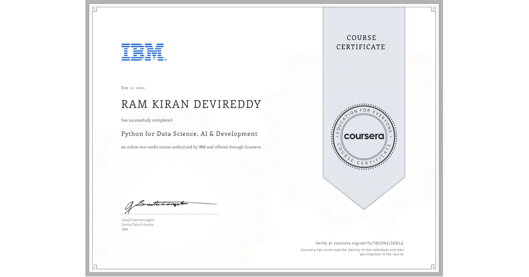 - Certificates Completed Tools for Data Science, Databases and SQL for Data Science with Python with Honors, Python Project for Data Science, Python for Data Science, AI & Development, Statistics for Data Science with Python.