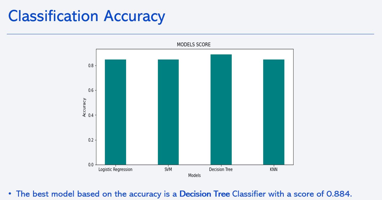 The best model based on the accuracy is a Decision Tree Classifier with a score of 0.884.